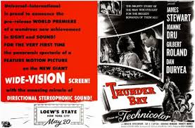 According to James Stewart biographer Jeanine Basinger, “Although it is somewhat unsettling today to watch a movie that sets a conflict between oil-drilling and nature—and oil-drilling is the hero—the machinery and the rig are photographed as things of beauty and majesty” (132) in Thunder Bay. From Basinger’s perspective, “Hard industrial grays and reds replace the greens and blues of nature and become the ‘colors’ of the modern era” (132). A. W. of The New York Times agrees, asserting that visually, “the complex off-shore drilling apparatus is the most distinctive aspect of Thunder Bay.” Shot in Technicolor and shown on an innovative “wide, curved screen [with] stereophonic [stereo] (or directional) sound” (A.W.) in the Loew’s State Theatre, Thunder Bay’s vast setting took center stage, overshadowing its weak narrative.
